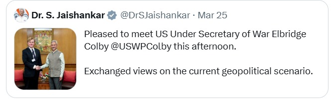 Perhaps the #IndianFM was moved by the flattery Colby accorded him the day before. Or perhaps